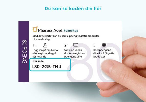 Koden inneholder både bokstaver og tall. Dette er din unike kode som du må registrere inne på vår nettside for å løse inn dine poeng. Hvert kort har en unik kode som kun kan brukes en gang.